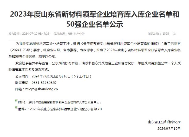 喜報!公司成功入選2023年山東省新材料領(lǐng)軍企業(yè)培育庫